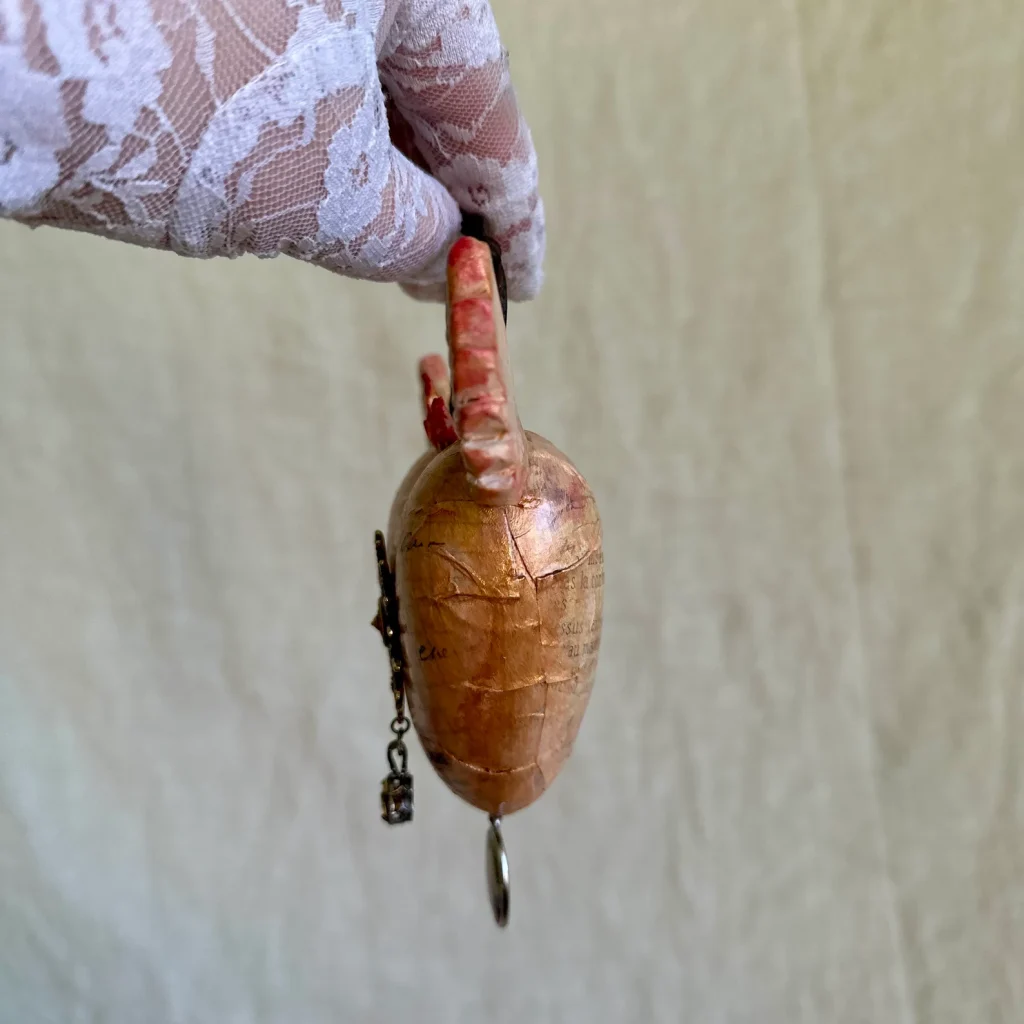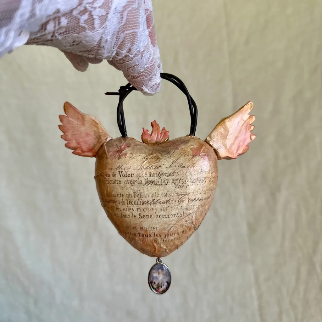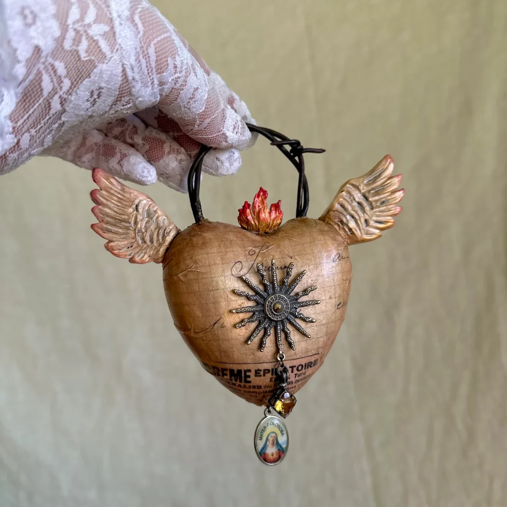 This heart papier-mâché sculpture is handmade with vintage paper, hand sculpted and painted wings and eternal flame. It’s also adorned with unique embellishments like: hand bent vintage barb wire, a vintage citrine color stone, a metal sunburst and a double sided Mother Mary and Crucifixion token.