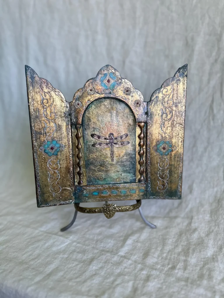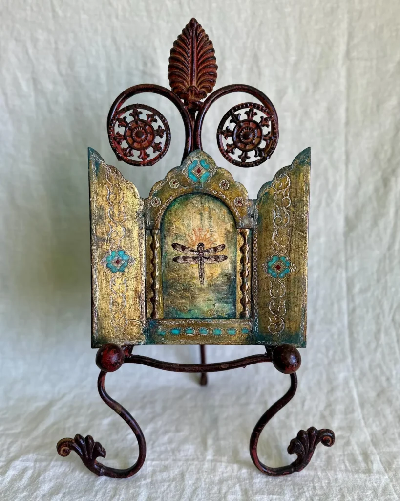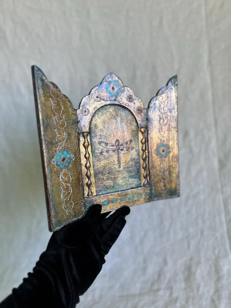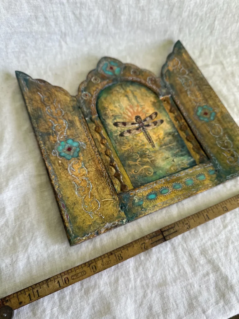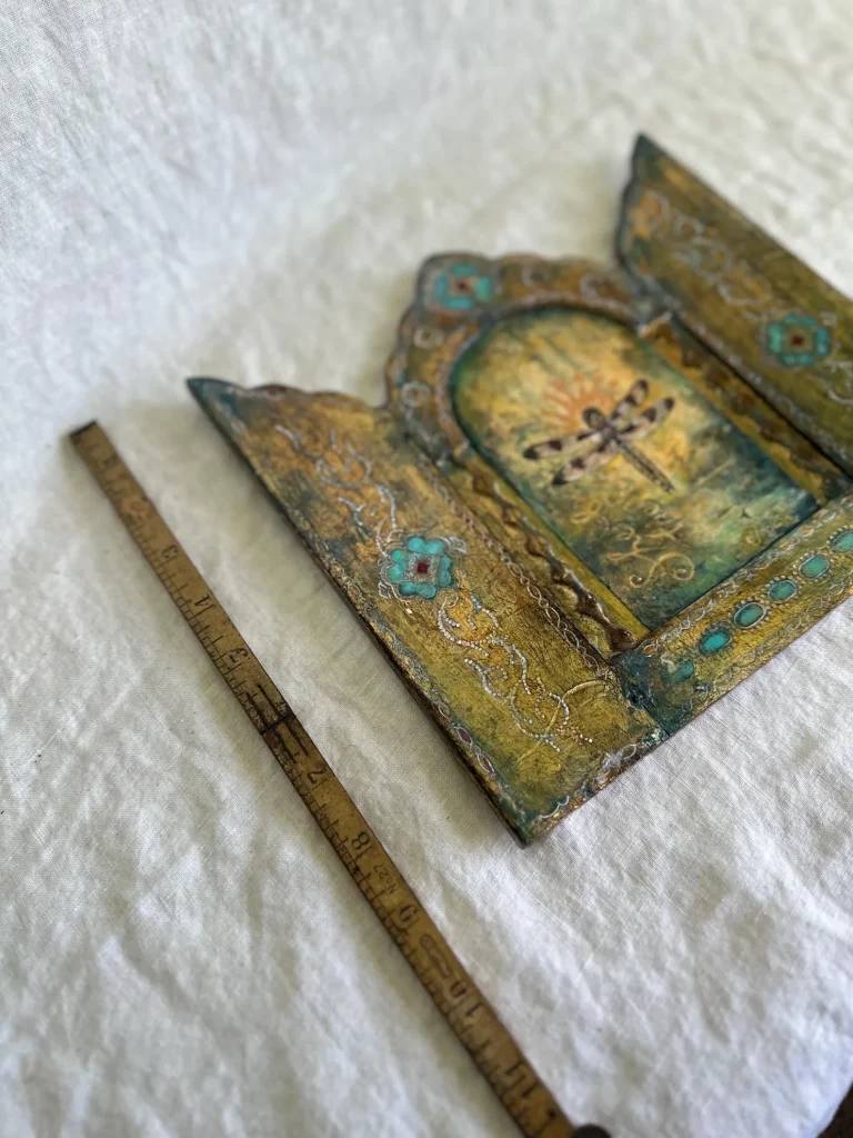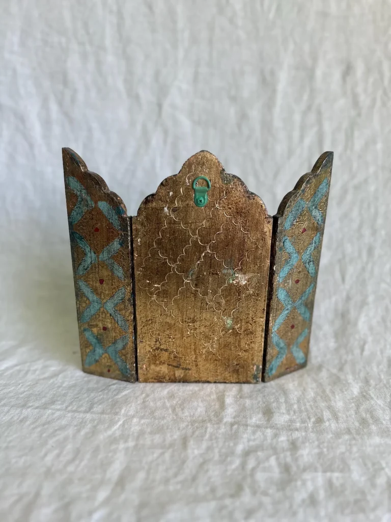 The vintage wood triptych has been preserved and transformed—its age-worn surfaces brought to life with soft turquoise, crimson, and burnished gold. The decorative flourishes, hand-painted latticework, and jewel-like accents evoke the feeling of an illuminated manuscript or a sacred altarpiece.
