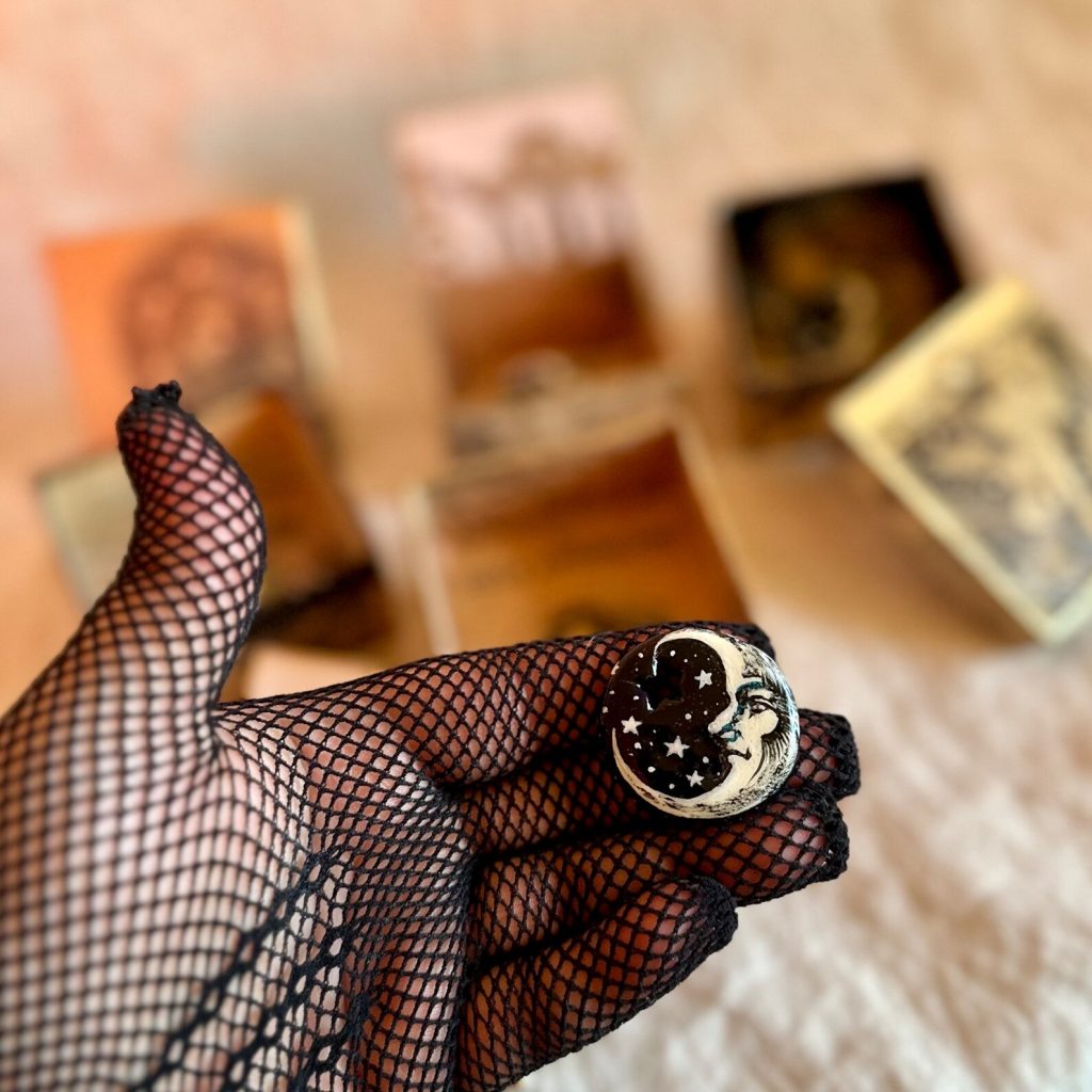 My moon magnets are hand sculpted and painted making each one similar, yet unique. They rang in size around 1 1/4” in diameter. There is a little star shape cut out at the top which show the surface behind the magnet OR tie this cute little moon onto a gift for a really fun way to add an extra gift to your package!