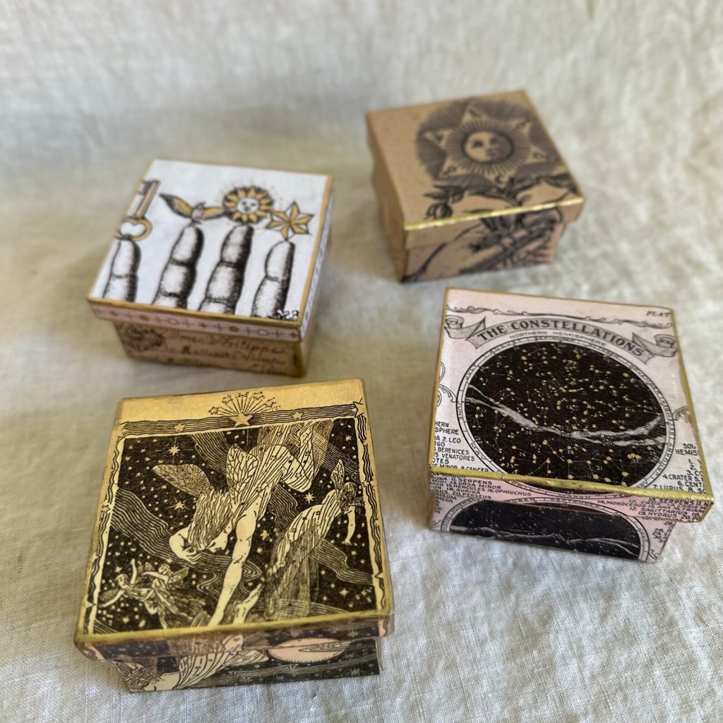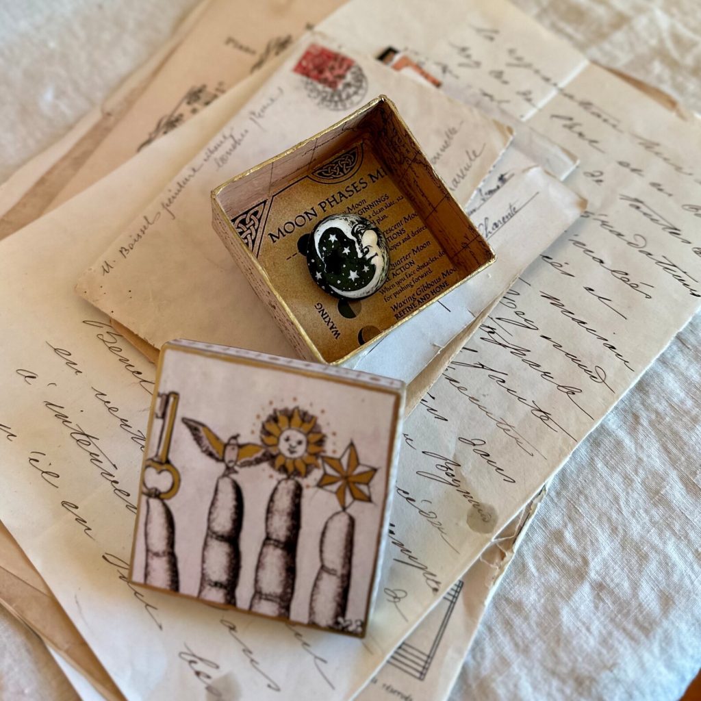 The Moon Boxes are adorned inside and out with different vintage celestial ephemera, like: French book pages and vintage style post cards making it a gift all on its own! Each box cleverly holds the magnets in place with a little star.